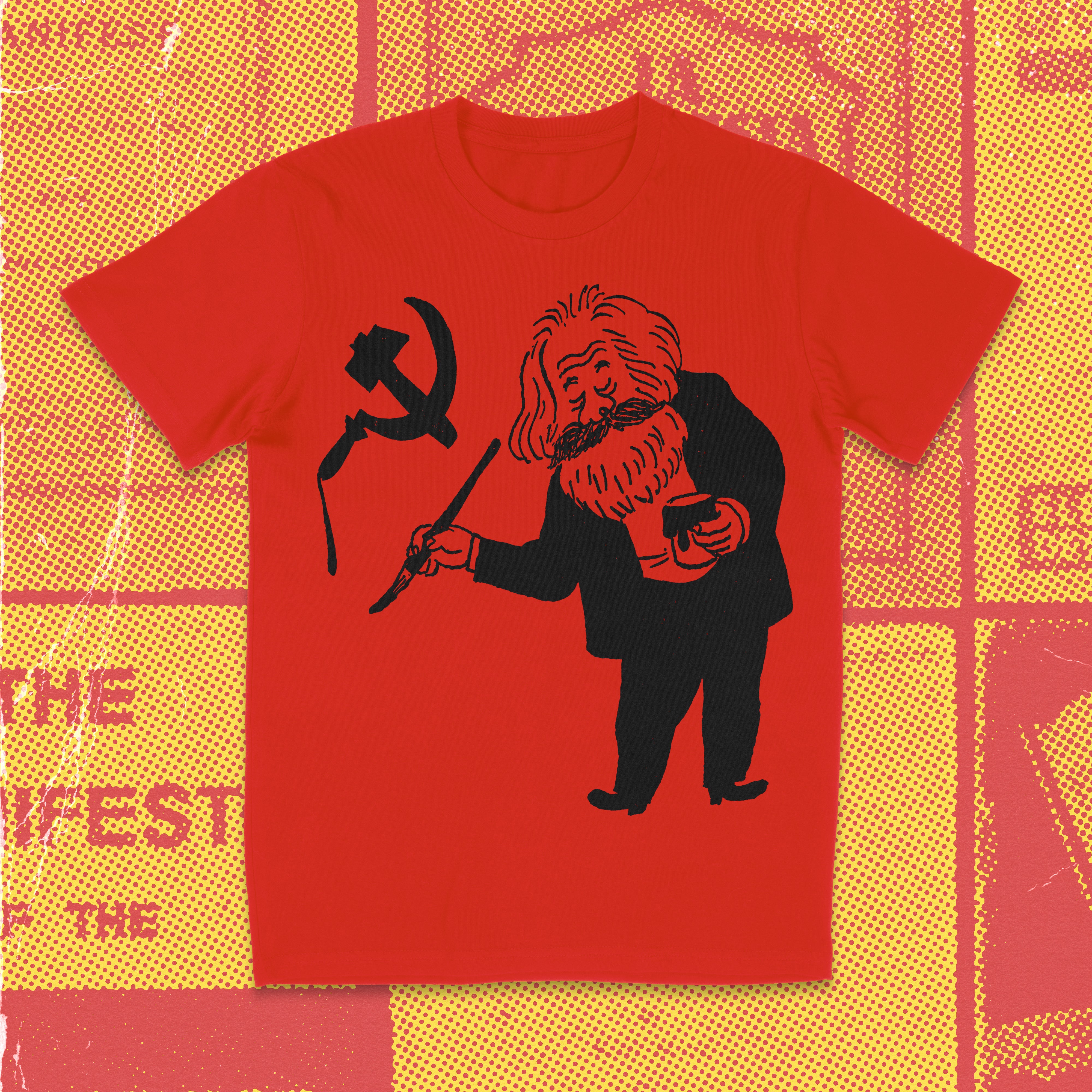 I didn't want to make the same shirt with the same one photo, so when I found this cartoon of Karl Marx in the 1958 Communism primer It Started With Marx, I was so charmed that I had to have it on a shirt.