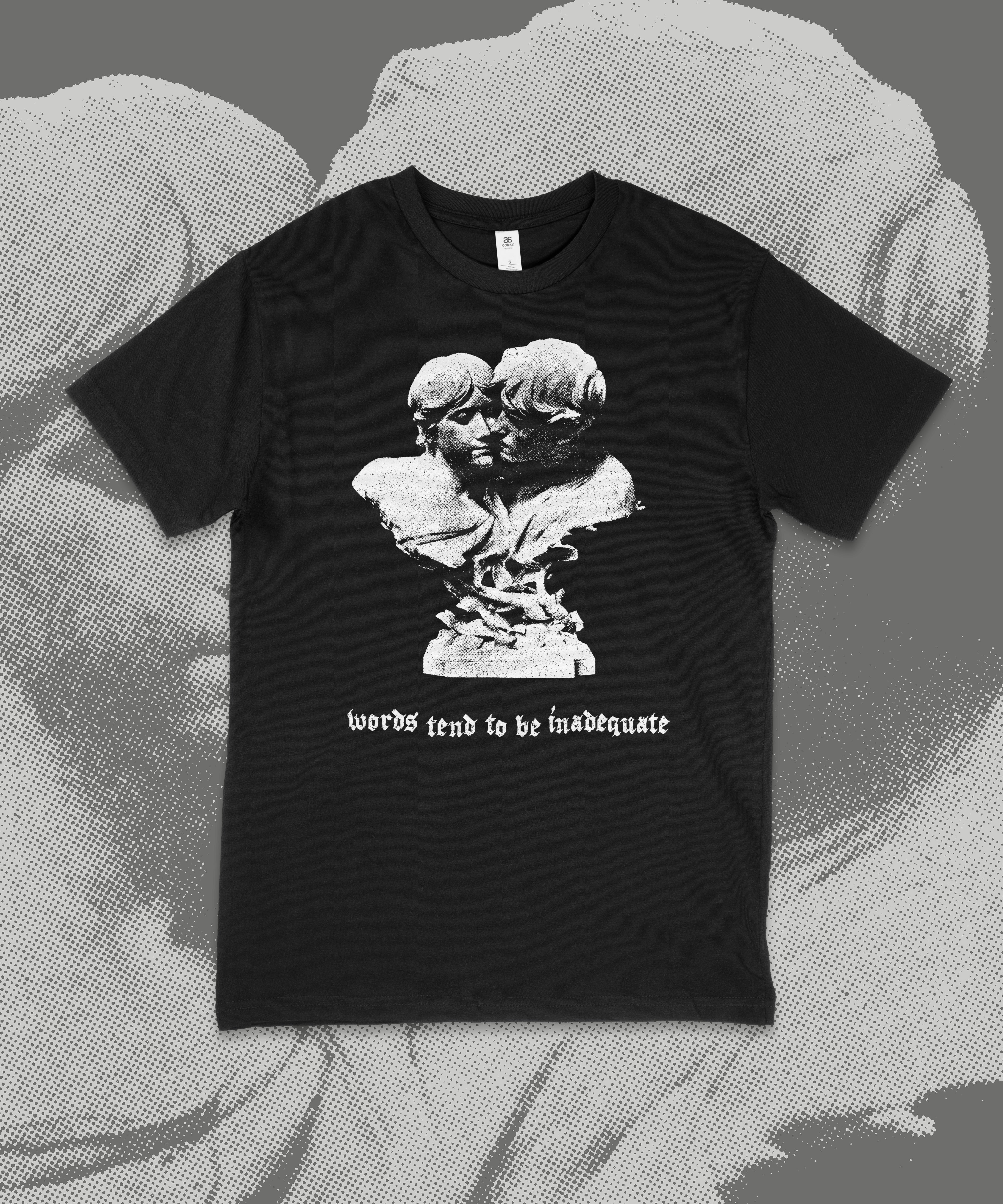 Hand-printed with white ink on a 100% cotton black t-shirt.