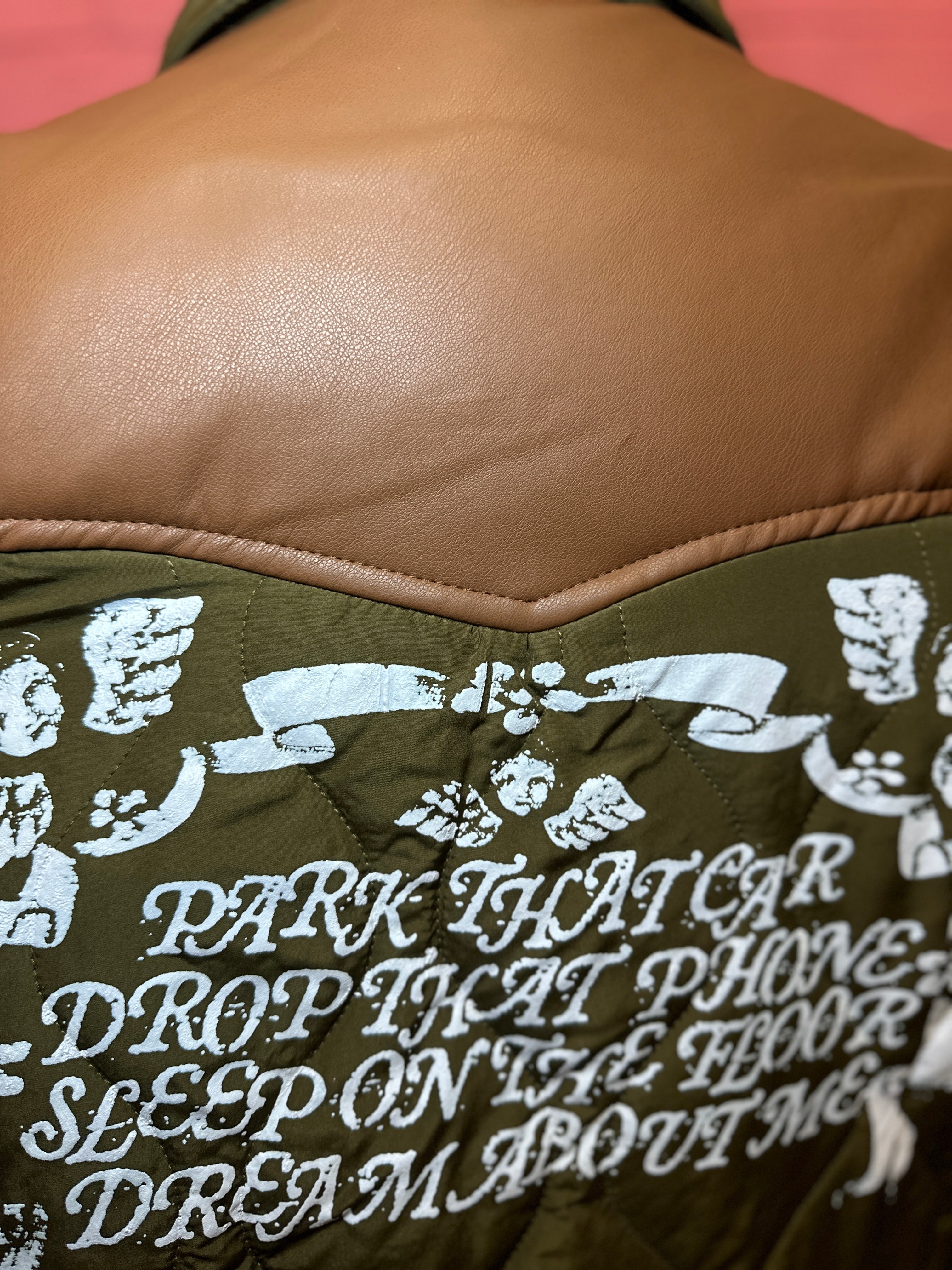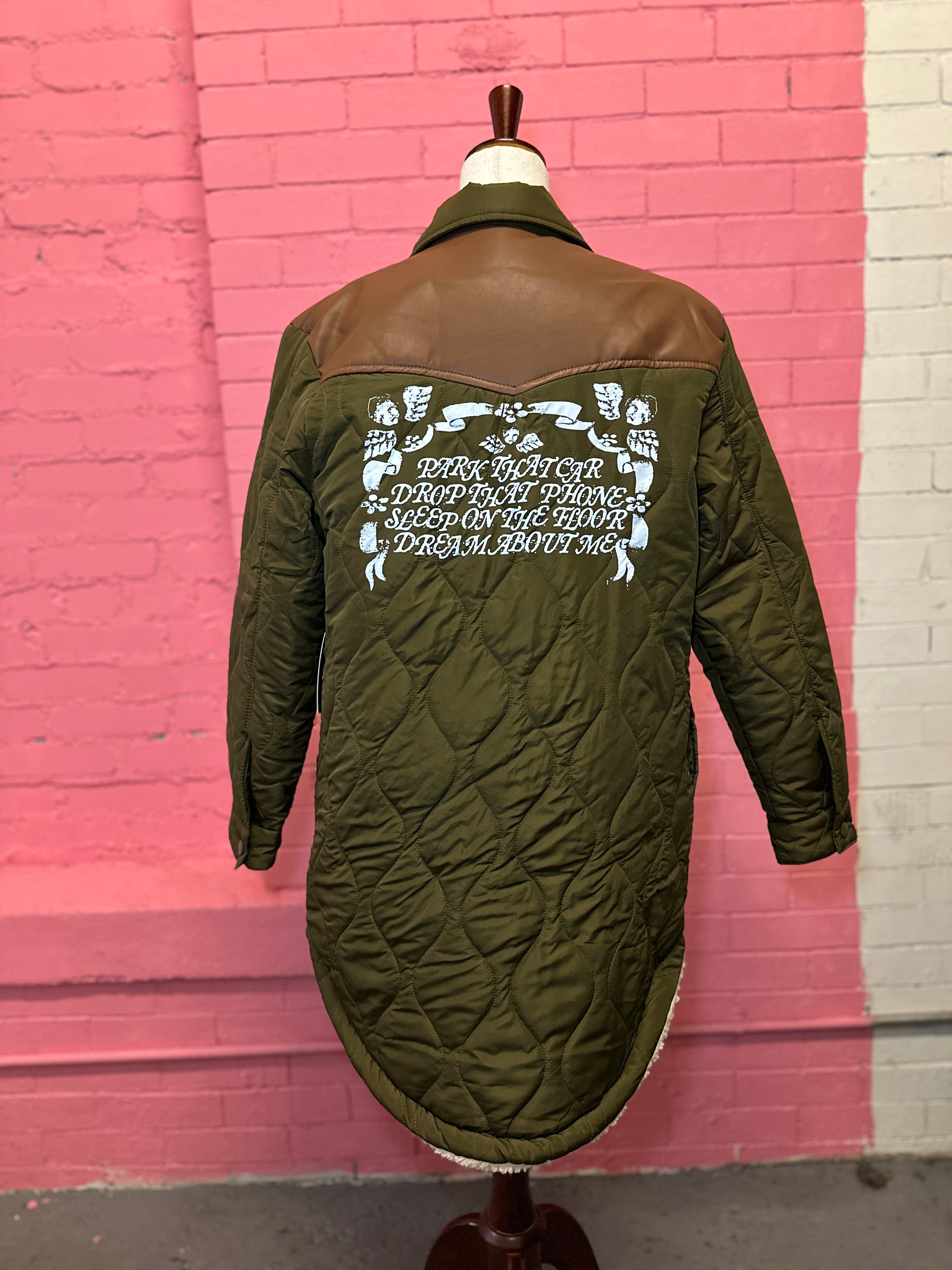 This was a test case to try my new low-cure inks on nylon, and it went pretty ok! New Anthems for a Seventeen Year-Old Girl design printed on the back of a quilted duster with western-style faux-leather yoke detail. One spot of splitting in the print where the fabric was folded (pictured).