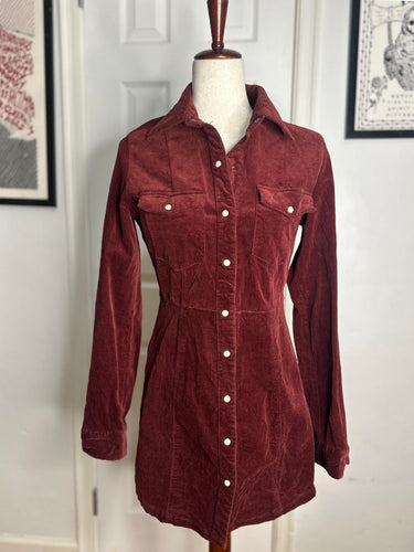 Corduroy pearl-snap minidress in a 70's style burgundy corduroy and dagger collar, from Forever 21. This is probably from ~2013.