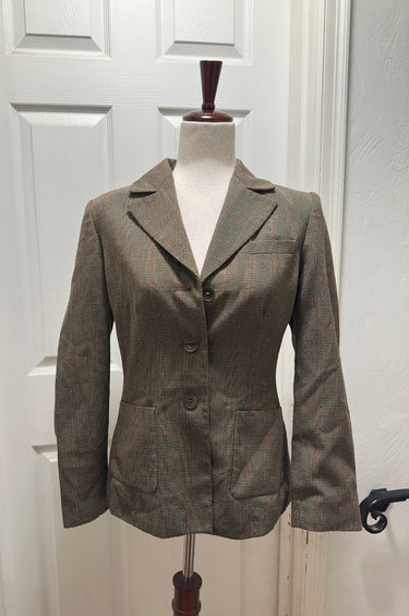 Brown and red glen check women's 3-button blazer with notched lapels and patch pockets from mall brand Evan-Picone. 65% polyester / 35% rayon shell / 100% polyester lining. Good preowned condition.