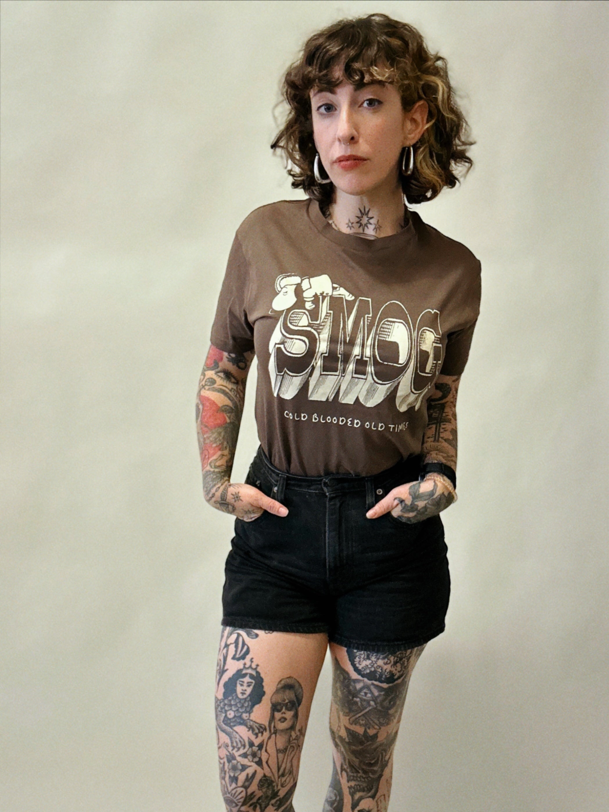 Hand-printed with khaki ink on 100% cotton walnut brown t-shirt.