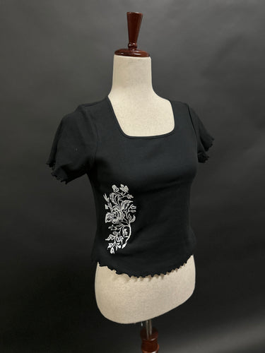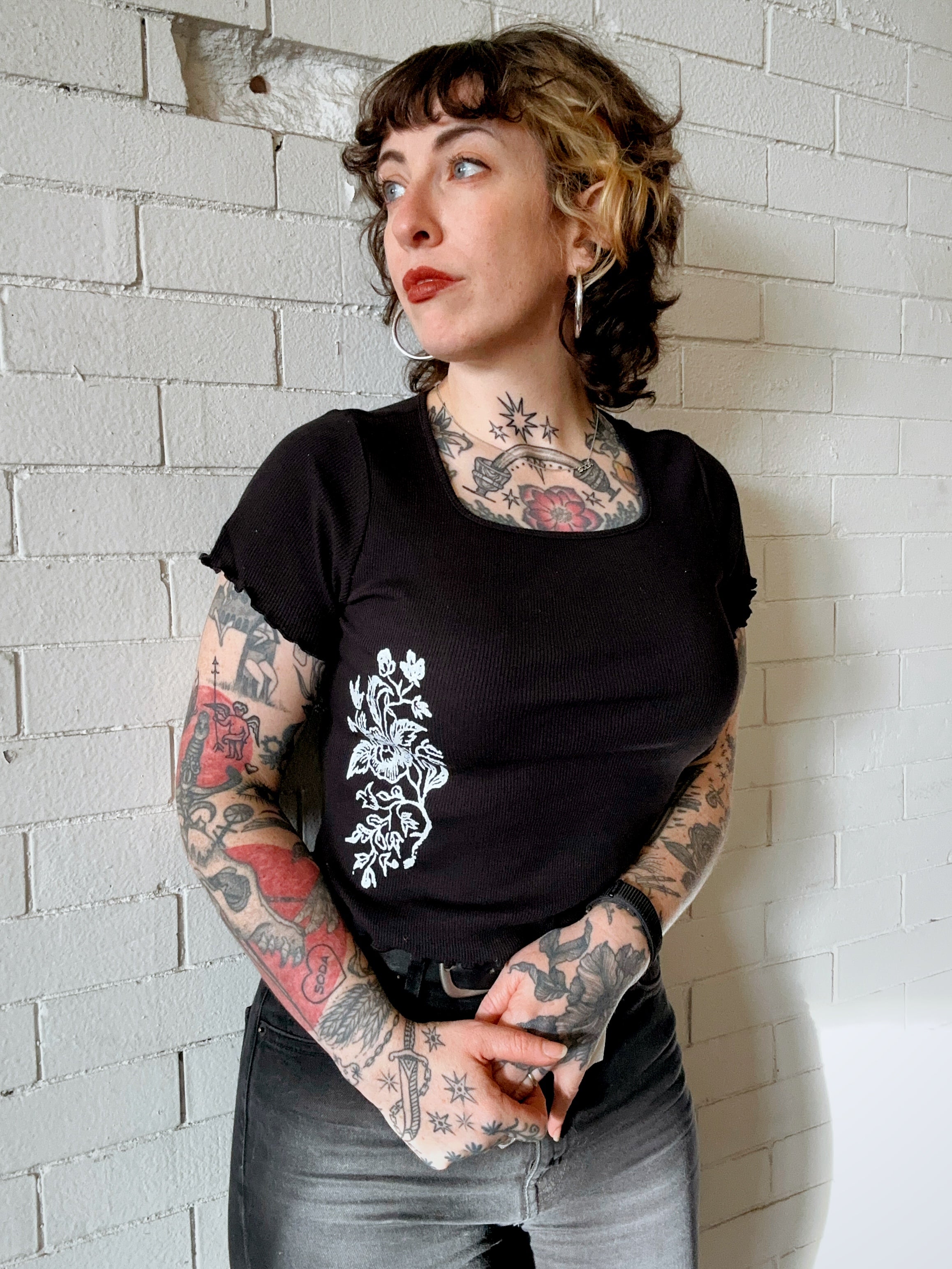 Printed on ribbed, square-neck, lettuce-hem cropped baby tee. This feels like something a Francesca Lia Block character might wear.