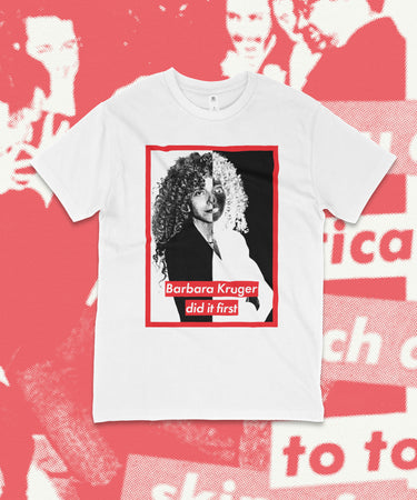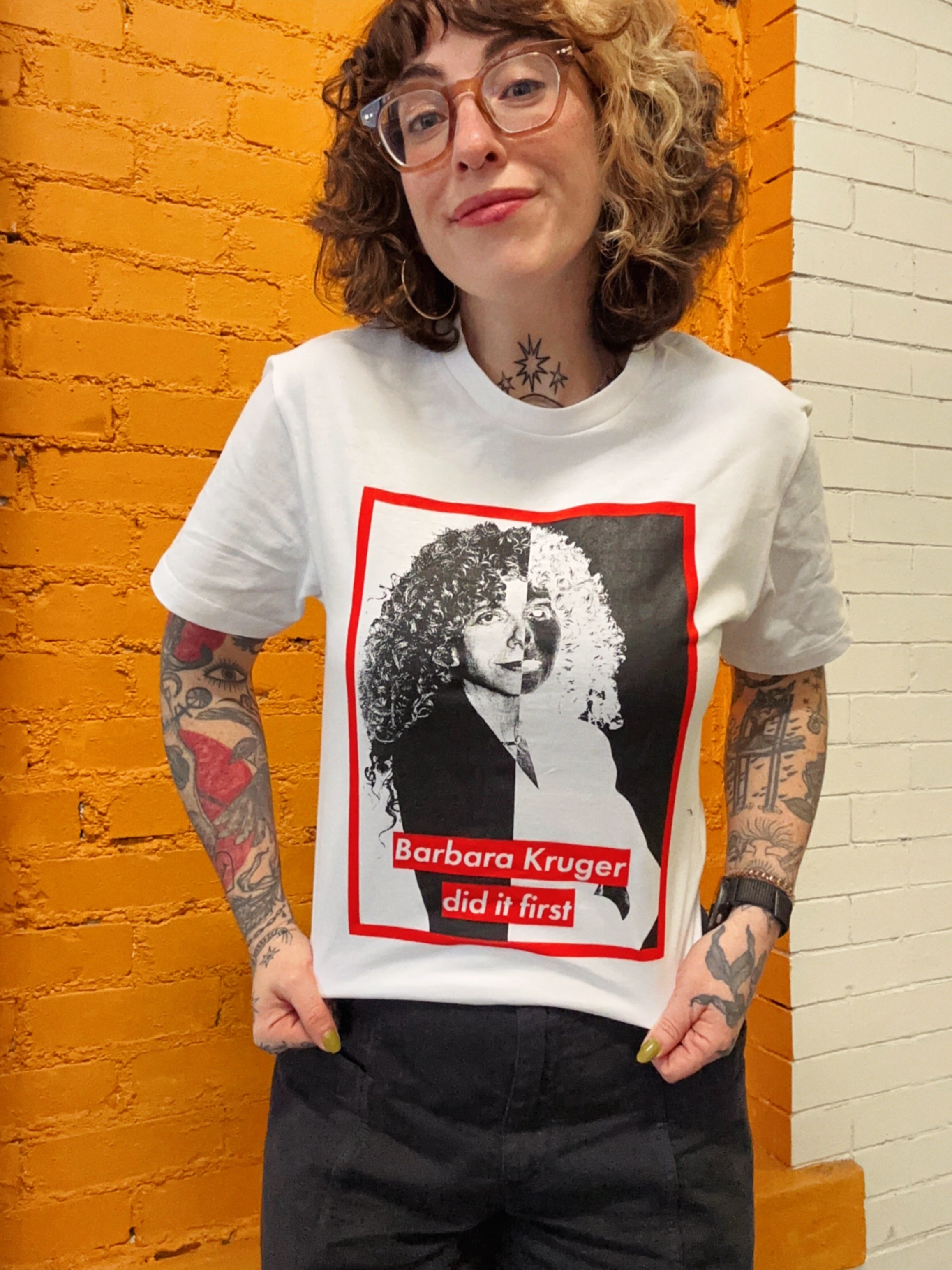 Hand-printed with red and black ink on 100% cotton white t-shirts.