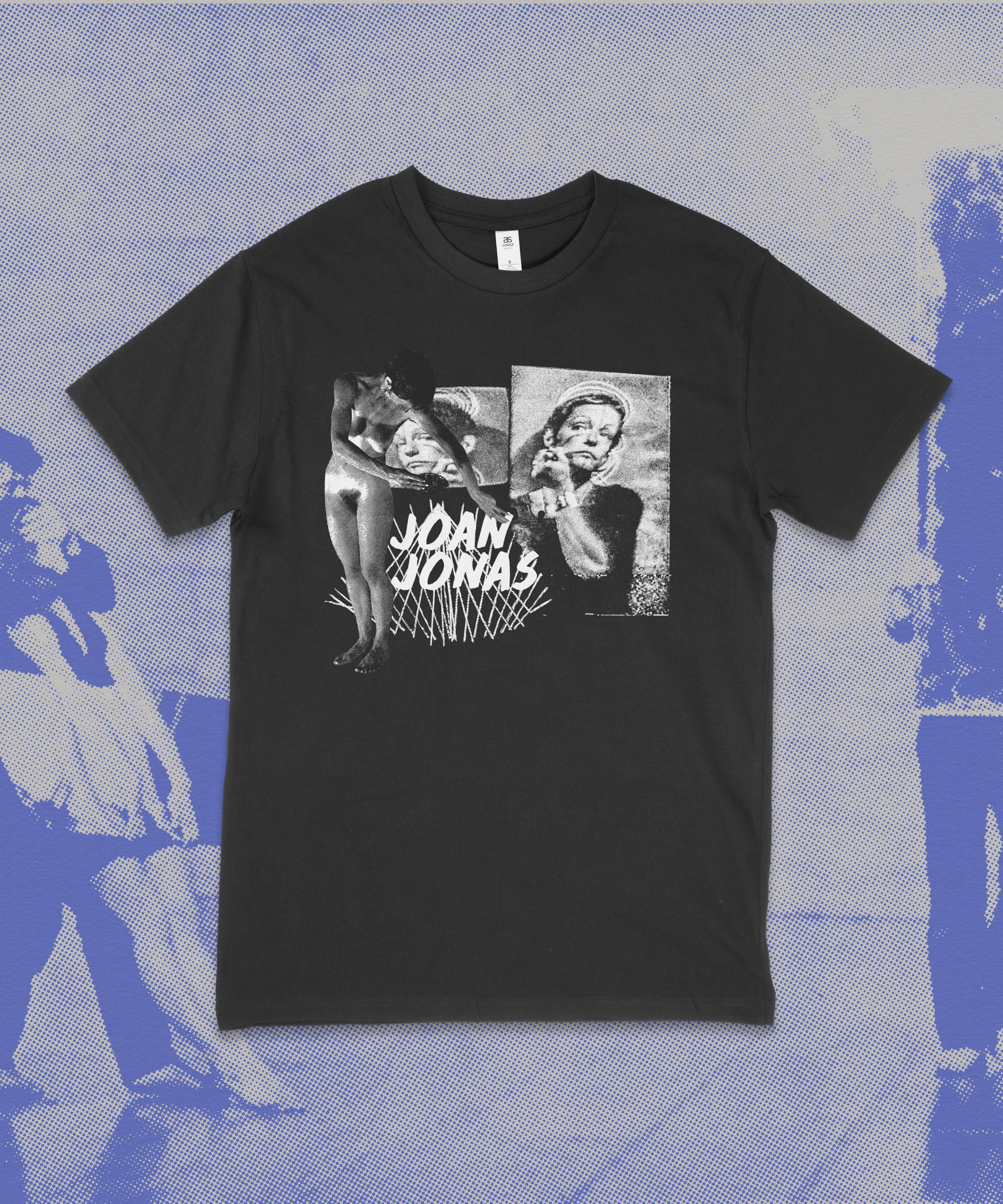 Hand-printed with white ink on 100% cotton off-black t-shirts.