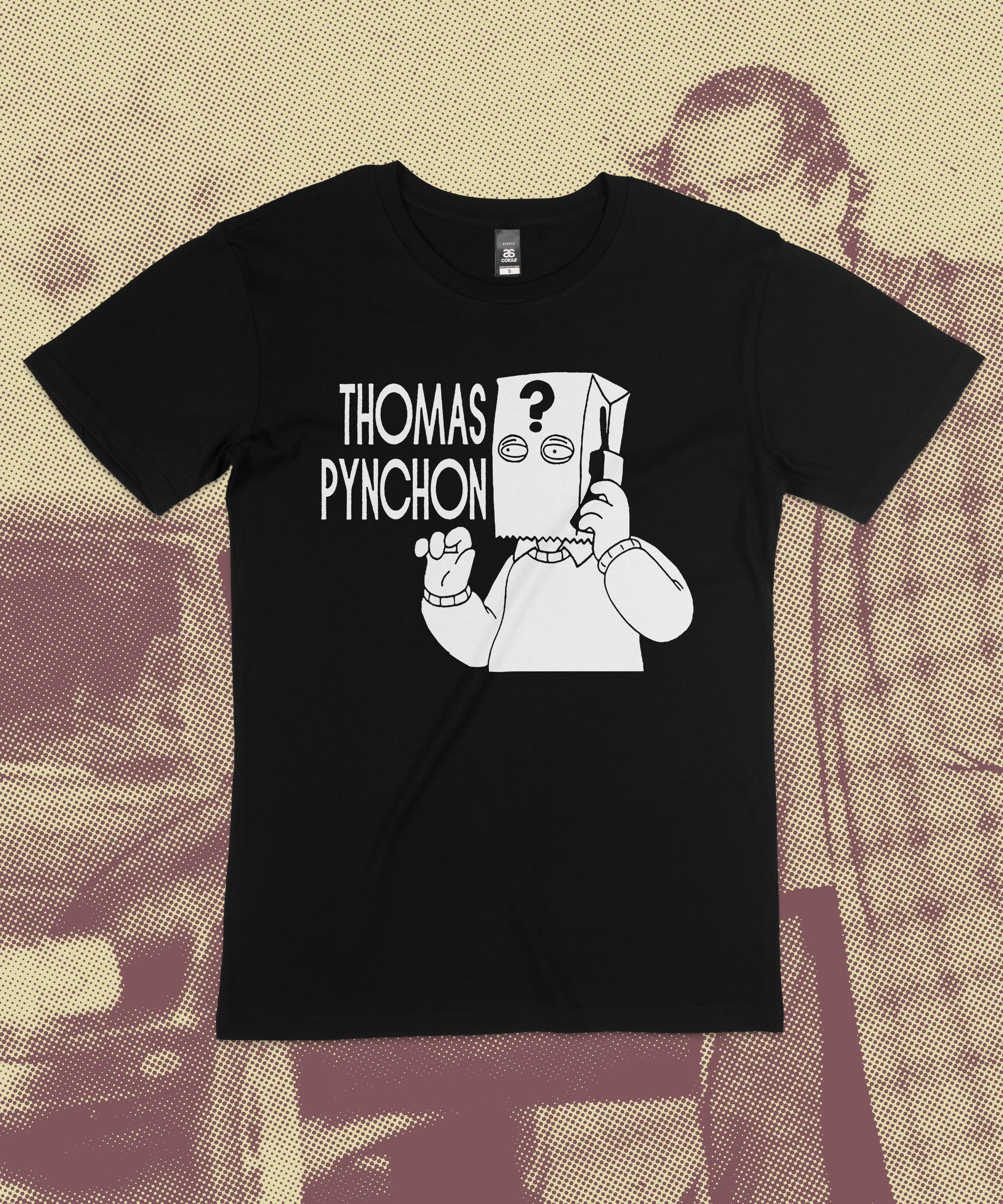 This is one of the only known images of Thomas Pynchon from the past 70ish years. Whether you reread Gravity's Rainbow every year (the few, the bold) or just love a Simpsons deep-cut and saying that a public figure is "a fucking Thomas Pynchon character," this shirt is for you.