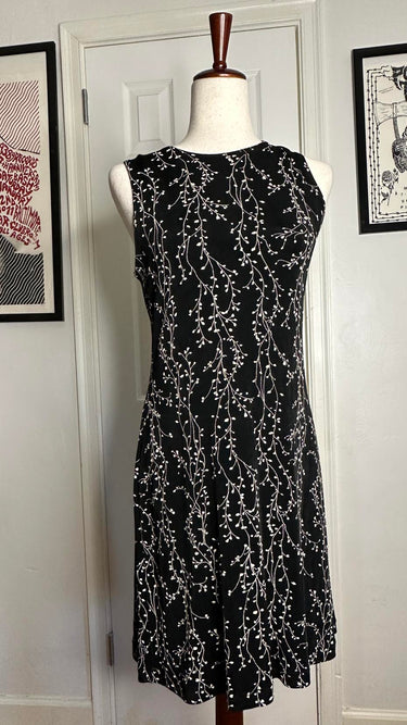 This dress goes with spiky space buns, platform sandals, and body glitter. Slinky black ribbed acetate with a slightly raised vine print.